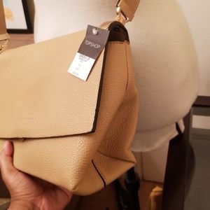 New..like a buttermilk tone.. purchased from topshop last fall. I purchased two at the time...u will receive the new one. Hardware is brushed light gold...cute casual look. See last pic for reference.