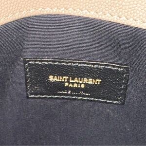 Chic Yves Saint Laurent clutch in beige. Features iconic gold logo. Ideal for stylish outings.