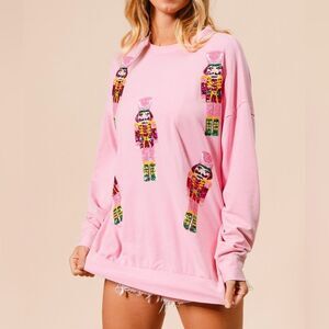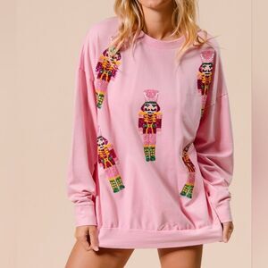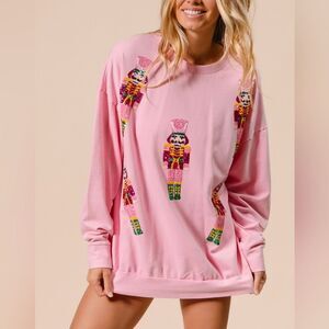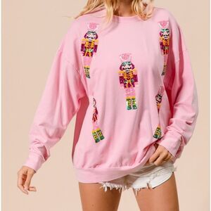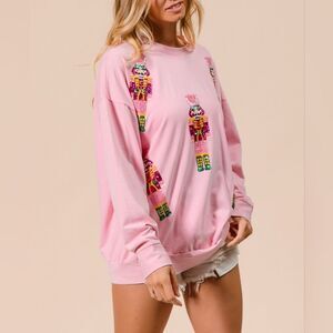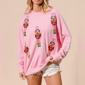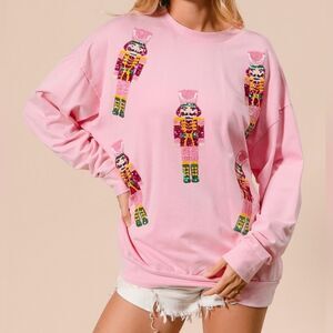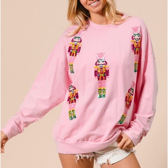 BiBi Sequin Nutcrackers Embroidery Christmas Sweatshirt - Light Pink