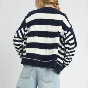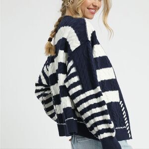 Chic and cozy striped sweater in navy and white. Perfect for layering and adding a stylish touch to any outfit.
