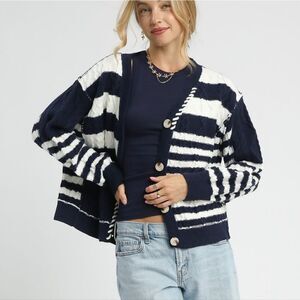 navy and white striped knit cardigan