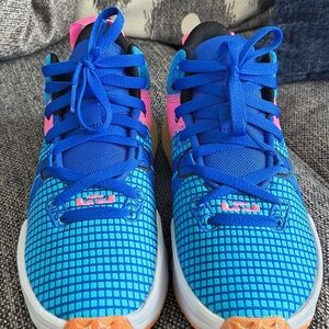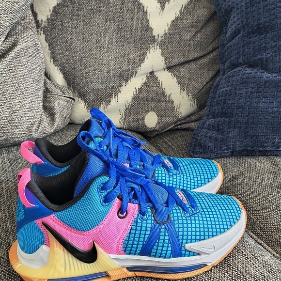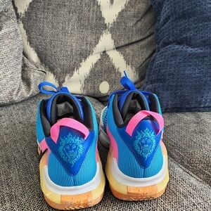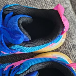 Vibrant blue and pink athletic sneakers with a stylish design. Features a distinctive black swoosh logo.