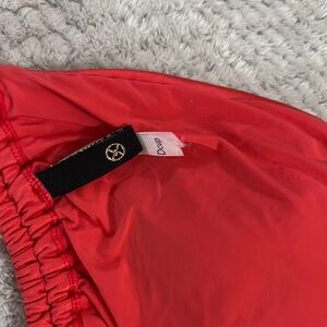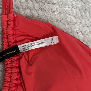 Stylish red halter bikini top featuring gold accents. Perfect for a chic beach look.