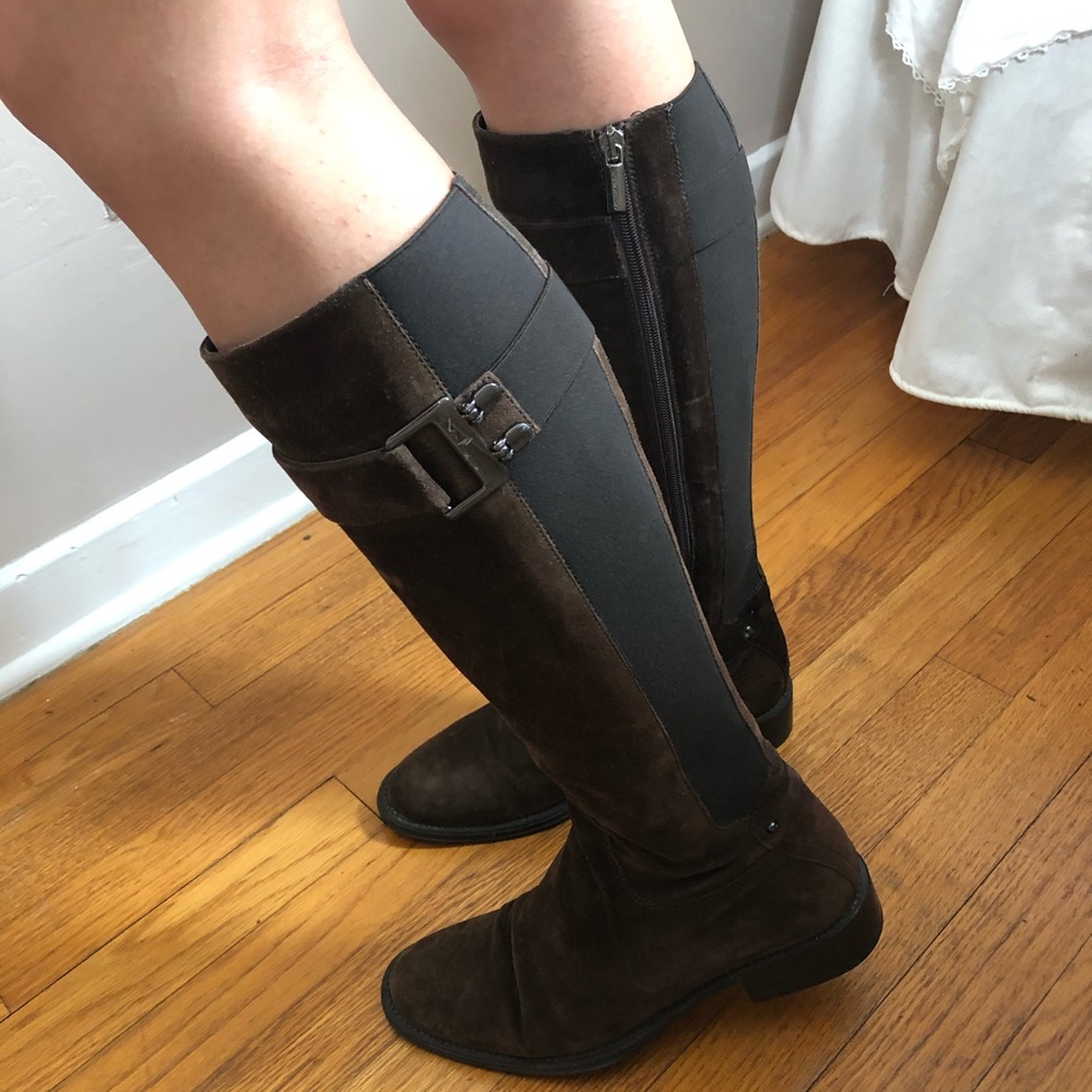 Love the quality of these flattering luxurious shoes! Featuring sexy chic gunmetal accent on buttery soft suede 1 3/4” heal round toe & elastic shaft Purchased at Nordstrom Perfect for fall & winter transitioning Pair it w/ leggings or ripped distressed denim jeans that are also sold in my closet Birthday Anniversary gift present Vacation Vegas trip wedding lounging date night dress cover up girls night out work attire Party break patrick