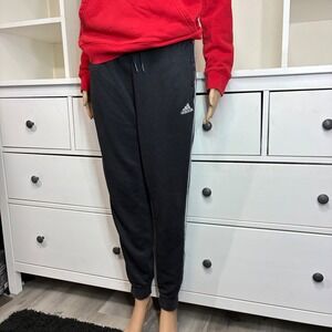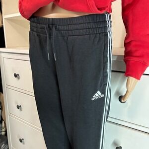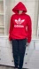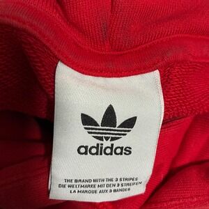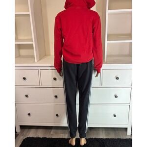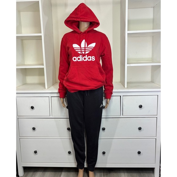 Adidas Trefoil logo hoodie in vibrant red paired with classic black 3-stripe jogger sweatpants. Sweatpants have some fading.