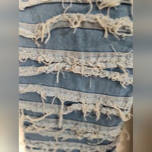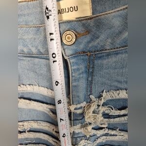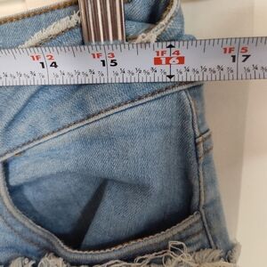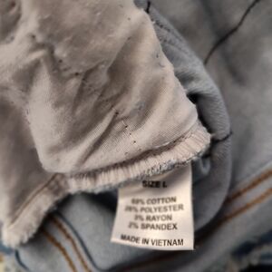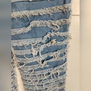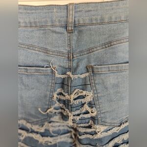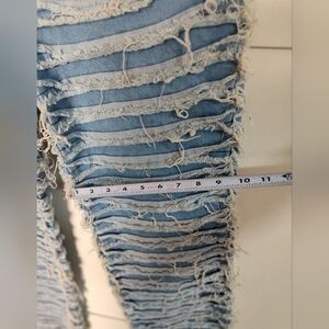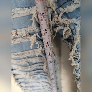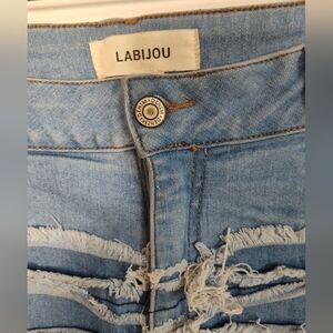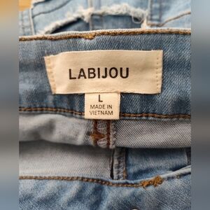 Shredded Denim Jeans Sz LG 30/32" Hip-hop Grunge Skater Unique VintageThe Labijou Shredded Denim Jeans in size LG offer a unique style for women who embrace hip-hop, grunge, and skater aesthetics. These relaxed fit jeans feature a shredded pattern and fringe accents, adding a trendy edge to the classic denim fabric. With a high-rise waist and a wide-leg style, these jeans provide a comfortable and on-trend option for everyday wear. The medium wash blue color adds to the overall appeal, making these jeans a standout piece in any wardrobe.