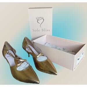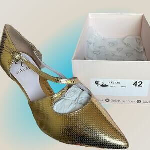 The Sole Bliss Cecilia Heels are a luxurious and stylish choice for women in size 11 US (42 EU). These elegant heels feature a pointed toe, 2.5 in. heel, and adjustable ankle strap for added comfort and support. Made from high-quality leather, these shoes are perfect for formal occasions like weddings, parties, christenings, and more. The gold metallic accents and cushioned insole make them a chic and sophisticated addition to any wardrobe for feet with bunions or need of a wider toe box. Originally $315 still on the website. See photos for manufacturer detail. Made in Spain by the brand Sole Bliss, these heels embody a sense of royal elegance and are sure to make a statement at your next special event.