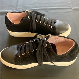 Stylish black leather suede sneakers with silver sparkle detail and side zipper. These must have handcrafted Italian made sneakers are famous for comfortably for wide feet and those with bunions. The low platform low sole with ultra cushioned footbed provides all day comfort and support