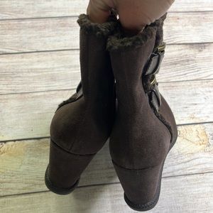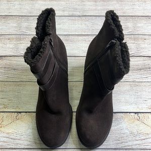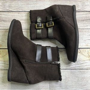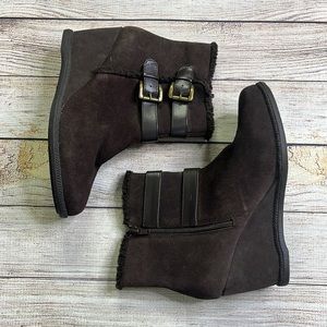 Sole SenseAbility Wedge Heel Leather Shearling Lined Ankle Bootie. Great condition. Very little wear. Zipper inside ankles. Faux straps/buckles.
