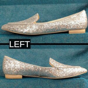 - Shiny silver glitter pointy toe flats. Classic loafer design with trendy pointed toe box. Lightly padded for comfort. Nearly flat 1/2" low heel. Great for casual wear or dressed up for the holidays!
