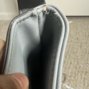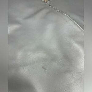 Vegan leather. It is in good condition except for some peeling on the leather. Please see all pictures for flaws. All zippers on the back and front are working. It still has lots of life left in it.