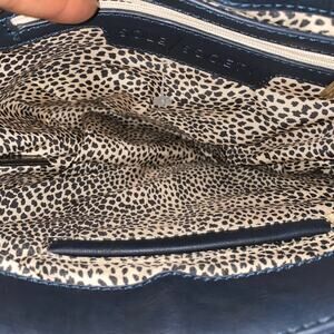 Sole Society Nordstrom Vegan Leather Flap Front Crossbody Saddle Bag Purse Navy Blue with gold hardwear and leather print interior. Two additional interior pockets - one zippered, snap closure, adjustable strap. Measurements: 9.25" Width x 11" Length x 4.5" Depth