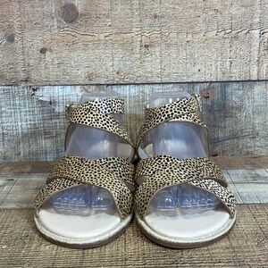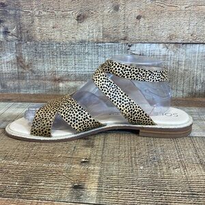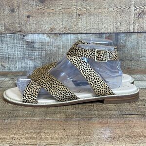 Sole Society Saden Strappy Sandals Women Size 10M Tan Black Cheetah Print Buckle Closure. Calf hair. Ankle Strap with Fully Functional Buckle. Flat Sandals. Casual Basic