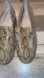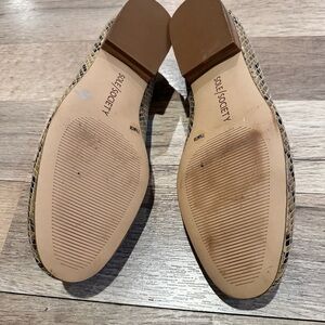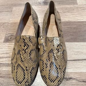 Elevate your style with Sole Society's tan and black flats, featuring a striking snakeskin print. These loafers offer a classic silhouette with a flat sole and slip-on design, perfect for both casual and dressier occasions.
