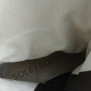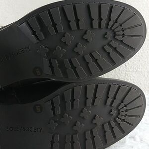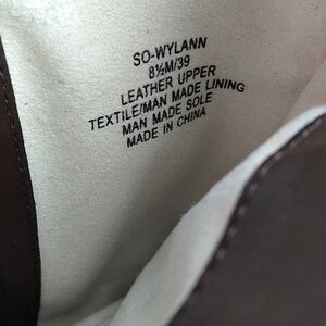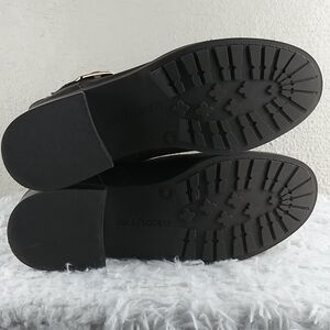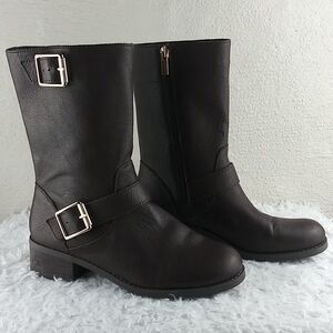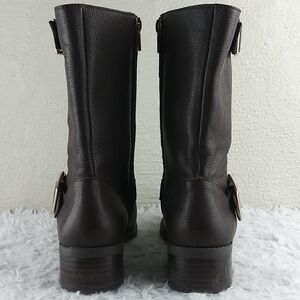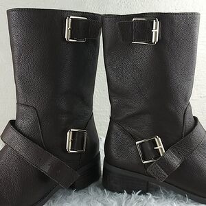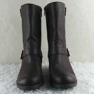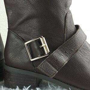Sole Society Wylann Women's Brown Leather Almond Toe Low Heel Harness Calf Length Harness Boots. Man Made Rubber Textured Sole. Fabric Lining. Full Side Zipper Closures. Gold Three Hole Buckled Hardware Detail. Store Shelf Wear On Heel/Sole. Small Scuff On Toe. Measurement approx. Heel: 1.5". Size 8.5M/39. NWOT