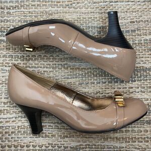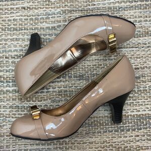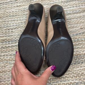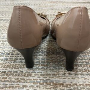 Nude Heels Gold bow In excellent condition with minor scuffs as shown Worn a handful of times 3 inch heel