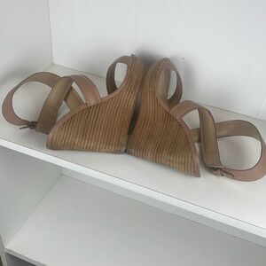 Additional Details: Stacked wood look wedge and platform, supple leather uppers in a nice neutral nude color, single strap across toe area with crossover adjustable ankle wrap straps. Style is SO-TAMMY.