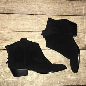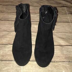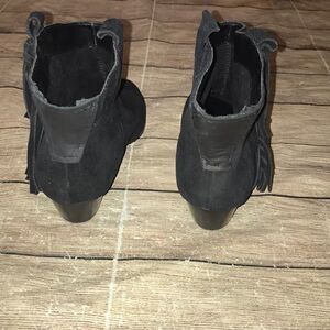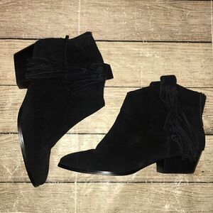 Great, preloved condition. Sole Society Kemi Suede Fringe Booties. Black ankle boots. Knot fringe detail down the side. Pull on. Western, boho. Stacked heel. Slight wrinkling to the toe area and minimal signs of wear to the soles.