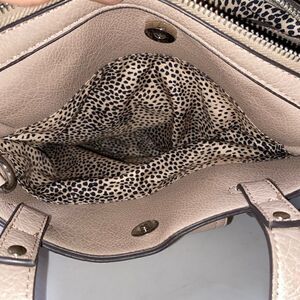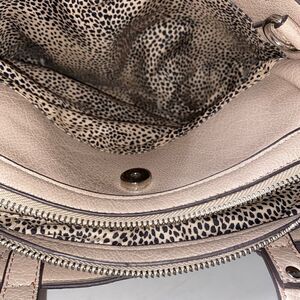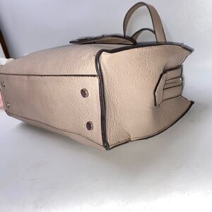 The Sole Society Leather Satchel is a stylish and functional handbag with a timeless design that is perfect for all occasions. It features a beautiful nude-colored leather exterior that is soft to the touch and adds a touch of elegance to any outfit. The bag has a structured shape and features two top handles and a top zip closure to keep your belongings secure. The interior of the bag is lined with a soft fabric and features multiple pockets to help you stay organized, including a zip pocket, two slip pockets and front and rear exterior pockets. The satchel is spacious enough to hold your daily essentials such as a wallet, phone, makeup, and more. The Sole Society Leather Satchel is a classic and versatile option for anyone who appreciates quality and style in their handbags.