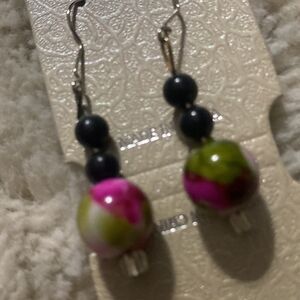Cute drop earrings from Solee Accessories! Each earring has two black balls sitting on top of a unique designed ball in the colors of olive green and fuchsia.