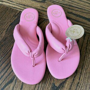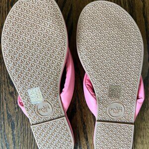 The Gisel Sandal, made by Solei Sea, is a very comfortable pillow strap sandal. The color is Flamingo (pink), size 9, and has padded straps, footbed, and arch support. Made of water-resistant vegan leather with flexible non-slip rubber bottoms.