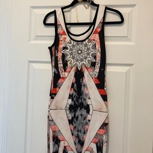 Size Small Sleeveless dress multi colors Black orange cream a bit of yellow Solemio Los Angeles fitted bandage dress 90% polyester 10% Spandex Perfect condition