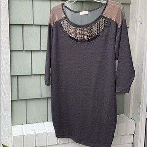 This is a very unique sweater that will grab anyone's attention. It would look great with faux leather pants or leggings! It is gray with a sheer bronze metallic fabric at shoulders. It is in excellent used condition. Listing is for sweater only.