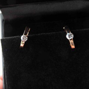 These are like 2 earrings in 1. They are made of solid 14K rose and white gold in classic hoop shape and are decorated with sparkly fianite stones on both sides.