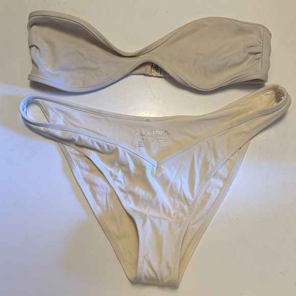 Two-piece bandeau bikini in cream. Smooth fabric with minimal detailing. Secure clasp at back. Classic low-rise bikini bottoms.