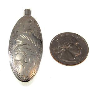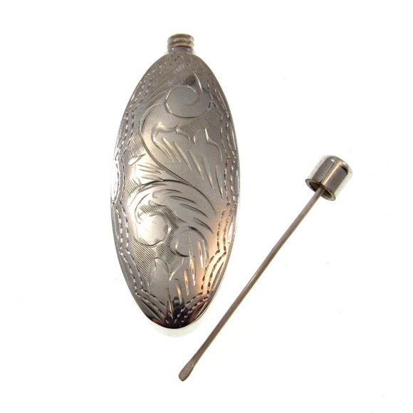 Solid 925 Sterling Silver Etched Oval Perfume Bottle / Flask with Dip Stick