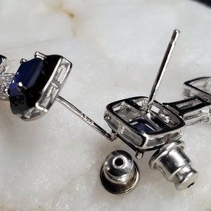 "Spiritual Status" Solid 925 Sterling Silver, Light & Elegant earrings/studs with Natural Raw Sapphire Stone and White Topaz/diamond cut cushion, Black enamel.