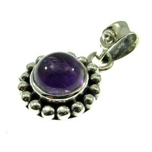This pendant showcases a rich purple amethyst cabochon framed in raised silver beadwork, echoing classic Balinese styling. The high-polish domed stone offers a deep, luminous glow, balanced by bold texture and a compact form that suits both daily wear and layered looks. Crafted in solid .925 sterling silver, this piece delivers color and presence without overwhelming — ideal for anyone drawn to timeless artisan design with a mystical edge.