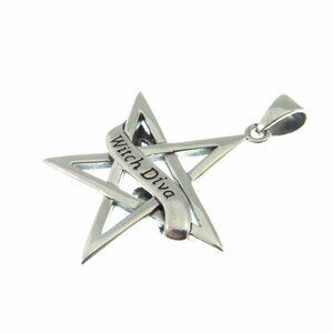 This striking pentagram is cast in solid sterling silver and engraved with the phrase "Witch Diva". This bold design combines witchy style, gothic fashion, and pagan symbolism, making it a meaningful accessory for those who embrace mystical energy. The polished star and engraved banner create a distinctive look that stands out whether worn every day or saved for special occasions. Ideal for witches, Wiccans, and lovers of gothic style, this pendant makes a thoughtful gift or a powerful personal statement.