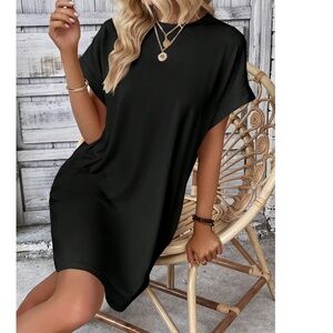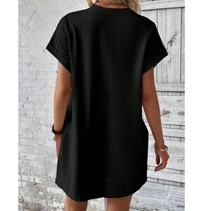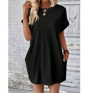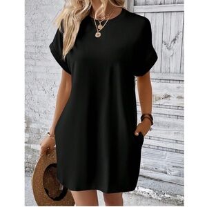 Solid Black Cuff Sleeve Pockets Minimalist Dress