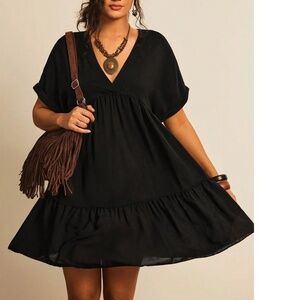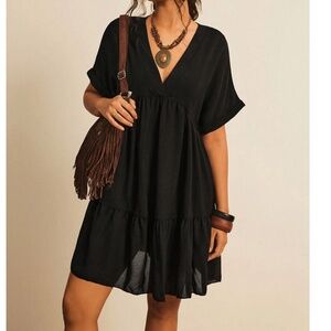 Solid Black V neck Short Sleeve High Waisted Ruffle Hem Dress