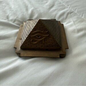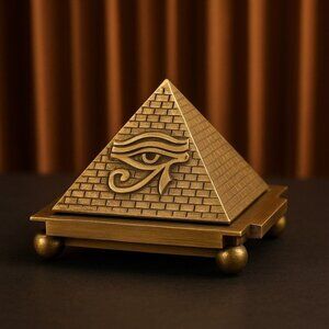 Elegant gold pyramid trinket box with Eye of Horus design. Perfect for storing small treasures.