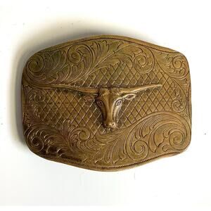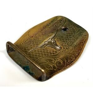 Solid Brass Ornate Belt Buckle Western Texas Longhorn 3”W x 2.25”H Cattle Cow. Shows some minor wear but overall good condition. Please see all photos.