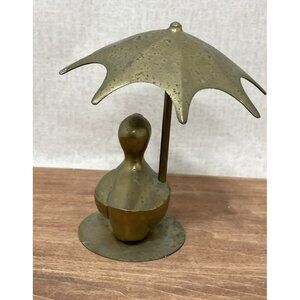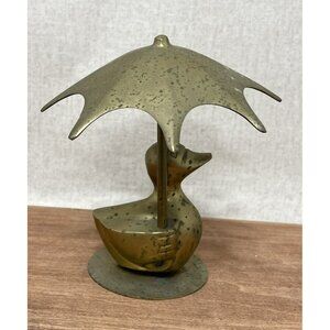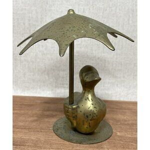This vintage brass duck umbrella figurine is a charming addition to any desk or collection. Standing at 5 3/4 inches tall, this cute paperweight is made of solid brass.