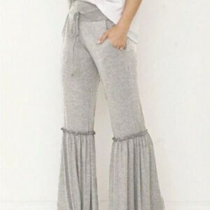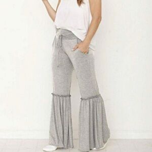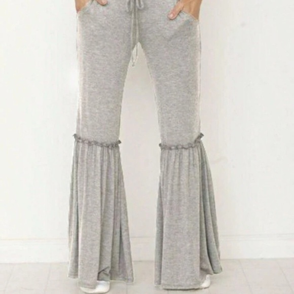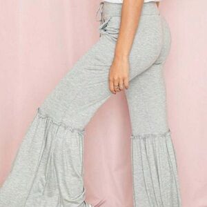 Solid Color Drawstring Wide Leg Bell Bottom Ruffle Lounge Pants. Elevate your style with these elegant gray flare pants. Perfect for a chic and comfortable look. New!