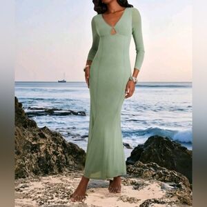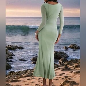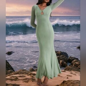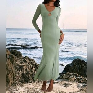 Solid Color Knit Mesh V-Neck Long Sleeve Fitted Maxi Mermaid Dresses For Women