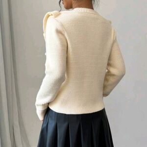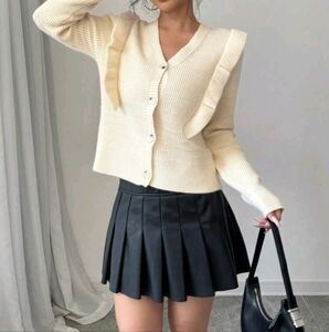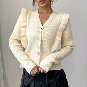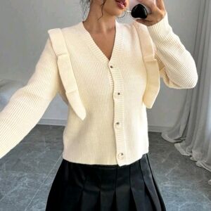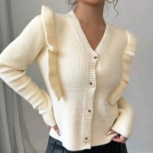 Solid Color V-Neck Elegant Long Sleeve Ruffle Hem Sweater Cardigan