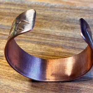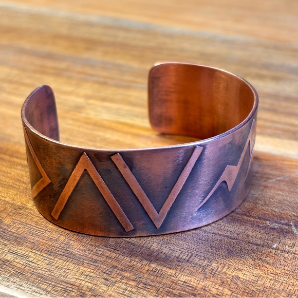 Stylish copper cuff featuring a bold geometric pattern. Designed for everyday wear and easy to adjust for comfort. The warm copper finish adds a rustic touch to any outfit.