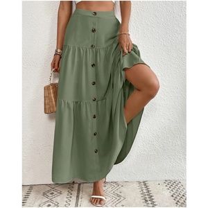 Solid High Waist Button Detail Ruffle Hem Maxi Skirt