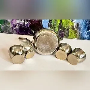 Teapot is approximately 3/4” inches tall and 1 3/4” inches wide. Teacups are approximately 6/8” x 6/8” inches.