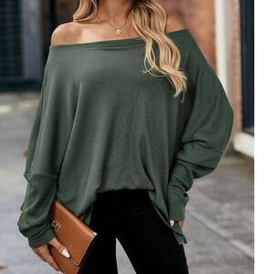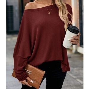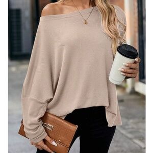 Solid Off Shoulder Loose Fit Waffle Long Sleeve Top