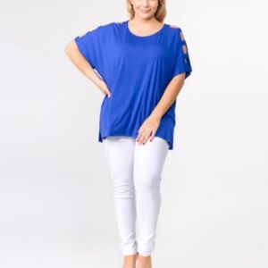 Solid short sleeve oversized silhouette featuring dolman sleeves with cut out details. Approximately 27" in length.
