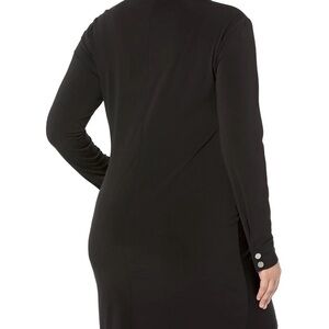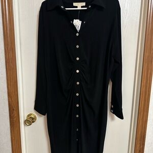 Elegant black dress with long sleeves and button-up front. Features a stylish ruched design.