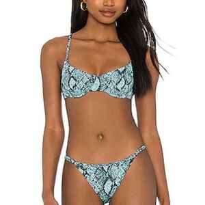 Description: Make a statement with this Solid & Striped two-piece bikini from the Revolve collaboration. Features a wire-supported top for lift and shaping, and adjustable bottoms for a customizable, comfortable fit. Bold blue and black snakeskin print adds a luxe, fashion-forward edge. Perfect for beach days, poolside lounging, or tropical getaways.