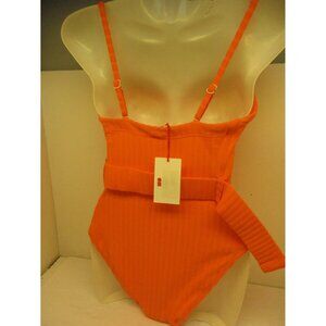 This vibrant orange Gema one-piece swimsuit features a belted design and ribbed texture, perfect for a stylish day at the beach or pool. New with tags, size small.