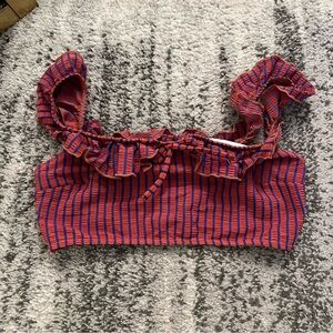 New without tags, never worn. Solid & Striped Paloma Striped Ruffle Bikini Top + Bottoms. Size medium. Top can be worn two ways.